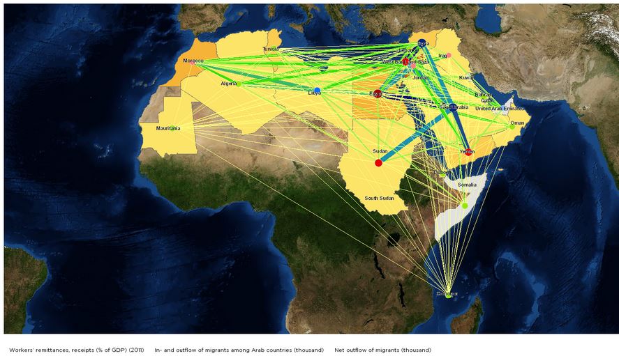 For example, a map may show yield gaps, regions with and without irrigation, routes for remittance and their relative importance in food security, trade infrastructure, economic growth, and resilience and conflict relationships.