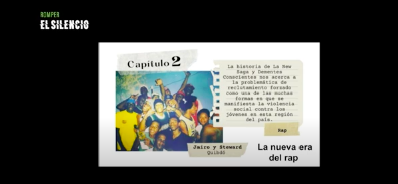 - Chapter 2: The New Age of Rap - The story of The New Saga, a rap group from Quibdó, tells of forced recruitment into criminal gangs as one of the many manifestations of the social violence against young people in Columbia, which led to the death of four of its members. It also introduces the efforts of people like Stiwar Palacios, with his initiative called Conscious Minds, which works to free young people from the conflict. Click here for a full description in Spanish.