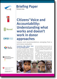 This Policy Brief summarises the synthesis report from a project that looked at what works and what does not work - and why/why not - in donor support to citizens' voice and accountability (C&V) interventions. It shares insights from a project, Evaluation of Citizens' Voice and Accountability, which was conducted from October 2006 through February 2009 in an effort to examine the relationship between the state and its people - in particular, the relationship between citizens' capacity to express their voices and claim their rights and government accountability.