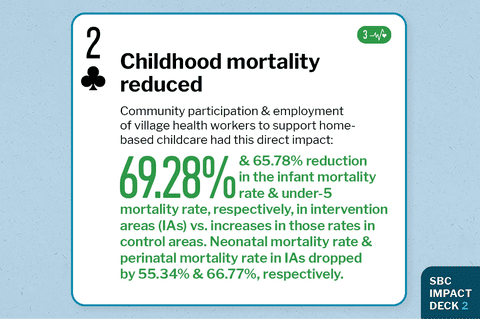 Strategy researched Community participation and employment of village health workers to support home-based child care (HBCC) in an impoverished area Impact achieved Country of study India Research methodology Cluster RCT Journal Journal paper title and link Excerpt from Abstract "The IMR and U5MR in IA were reduced from 106.60 and 147.21 to 32.75 and 50.38 (reduction by 69.28% and 65.78%, respectively) compared with increases in CA [control areas/clusters] from 67.67 and 105.3 to 86.83 and 122.8, respectively, from baseline to end of intervention. NMR and PMR in IA [intervention clusters/areas] showed reductions from 50.76 to 22.67 (by 55.34%) and from 75.06 to 24.94 (by 66.77%) respectively. These gains extended to villages in the service and replication phases." |