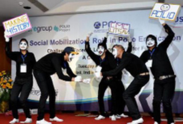 - From 'No' to 'Know' - A Consultation, "Social Mobilization: Role in Polio Eradication - Challenges Faced & Lessons Learnt for Future", at the India Habitat Centre, New Delhi, brought together public health experts, partner organisations, and the community to discuss how social mobilisation in polio eradication can lead to effective and lasting solutions for other public health issues. A theatrical performance was performed at the event with a narrator. This 45-minute wordless performance ("Pantomime") outlined the 11-year journey of engaging the community in polio eradication and overcoming communication challenges encountered by mobilisers and vaccinators. The panel discussions highlighted how the polio programme has been able to bring together various government departments toward changed behaviour, demand generation, higher utilisation of services - ultimately, as stated here, leading to universal coverage and empowerment of communities.