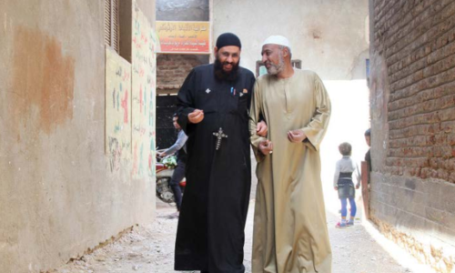 CRS website, August 30 2017. Image caption/credit: "Through the CRS peacebuilding program TA'ALA, religious leaders Father Rueis, left, and Sheikh Moustafa work together to engage the faithful in interreligious dialogue in the village of Al Odayssat in Upper Egypt. Photo by Nikki Gamer/CRS"