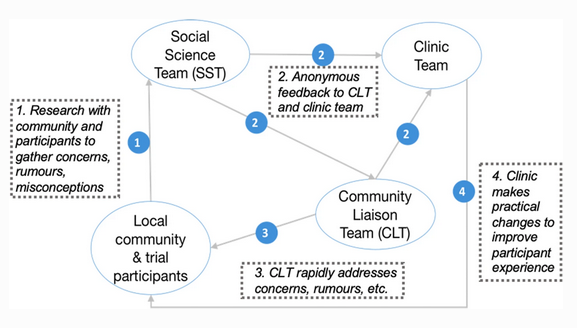 - Reciprocity - The inclusion of the independent SST and CLT served in different capacities as a bridge between the trial and the community. In addition, the CLT and SST offered an opportunity to provide confidential feedback, including potentially negative feedback or criticism, on their experience. One challenge they SST and CLT members faced in May 2018 was how the holy fasting month of Ramadan would affect trial participation. The strategy was to reach out to the religious leaders for advice, which demonstrated both reciprocity, as the community contributed directly to the functioning of the trial, and a respect (another one of the 4 principles) for local leaders and beliefs.