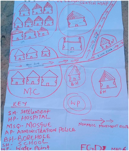 The International Organization of Migration (IOM) selected data collectors from the region for their language capabilities (able to speak English, Kiswahili and local Somali dialects) and familiarity with community and local leaders. Twenty facilitators and note-takers were trained in qualitative and geospatial data collection methods and split into four sub-regional collection teams. They also conducted a series of focus group discussions (FGDs) and participatory mapping exercises in order to better understand temporary settlement habits, migration patterns, and health-seeking behaviours. FGDs included community members available at the time of data collection but also individuals identified from the following subgroups: community youth, women, religious leaders, market vendors, healthcare providers and settlement leaders. Facilitators divided focus groups by gender due to cultural sensitivity and to support open dialogue.