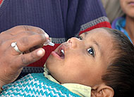 The second, Polio campaign underway!, focusses on the Moradabad district of India, where 26 cases of polio were reported previous to this campaign. It shows public health vaccinators at work and a young mother giving her baby to a public health mobiliser to receive the immunisation drops at a public booth. Children who receive the immunisation drops are marked with indelible green ink on the left little finger so that health mobilisers know they have been immunised. According to background information: "60 cases have been reported so far this year. This photo essay captures images of Polio Sunday in Moradabad, western Uttar Pradesh."