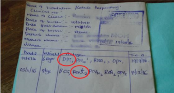 The study was a secondary analysis of information collected during the 2016 Kenya Missed Opportunities for Vaccination (MOV) Assessment conducted by the Kenya Expanded Programme on Immunization alongside its partners. Of 512 unique HBR images for review, 9% were of homemade records, which most often were a simple, ruled notebook on which the services delivered and dates of service were recorded by health workers. The image review identified several examples of errors related to the absence of standardised vaccine naming in record and the absence of structured areas for recording each recommended vaccine dose.