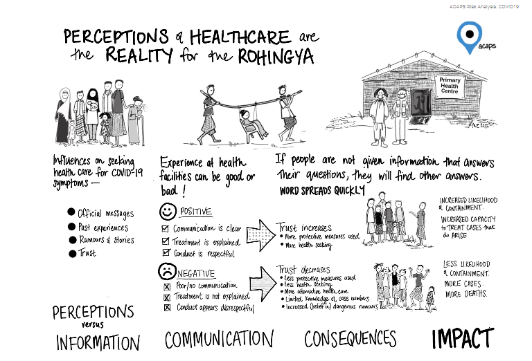 Due to factors such as high population density, poor hygiene, insufficient health facilities, and inability to self-isolate, the 855,000 Rohingya refugees residing in 34 camps in Cox's Bazar, Bangladesh are highly vulnerable to COVID-19. Lessons learned from previous epidemic responses, such as Ebola, highlight the role perceptions have on health seeking behaviour, trust in humanitarian responders, and the willingness of affected communities to comply with public health measures. The purpose of this thematic report from ACAPS is to support humanitarian agencies - who, along with the Government of Bangladesh (GoB), began rapidly implementing preventative measures and preparedness and response planning in anticipation of a potential COVID-19 outbreak in the Rohingya refugee camps.