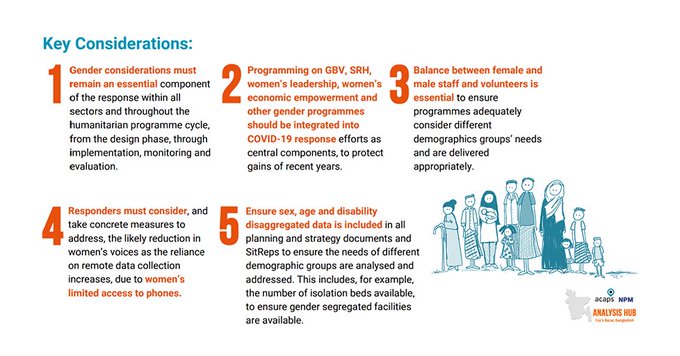 As the number of confirmed cases of COVID-19 rises among the estimated 860,000 Rohingya refugees residing in 34 overcrowded, makeshift camps in Cox's Bazar district, Bangladesh, humanitarian agencies must change the ways they deliver programmes in order to maintain physical distancing and adhere to strict hygiene protocols. By examining how these changes are impacting the ability to deliver gender-responsive and gender-sensitive programmes (GSP), ACAPS hopes in this report to inform humanitarian responders and enable them to consider strategies to mitigate any risks.