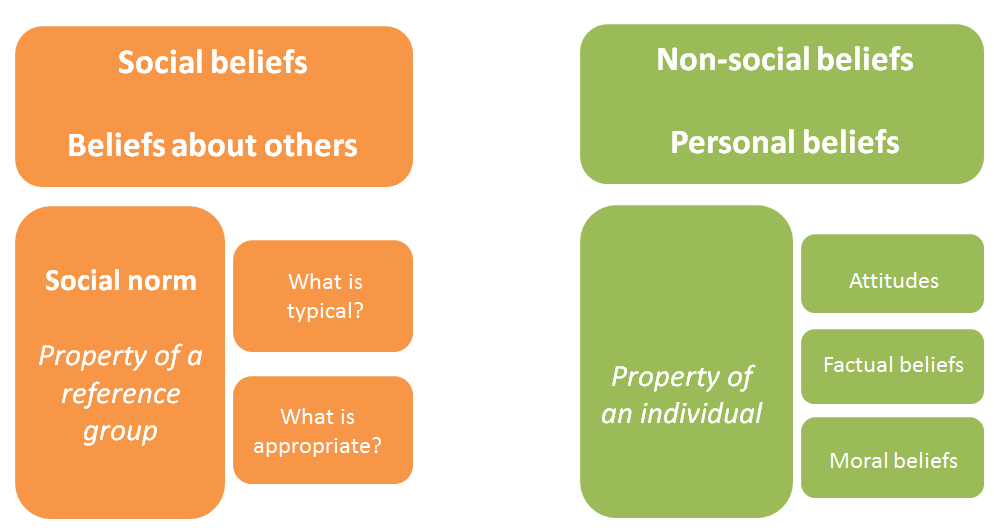 A table in the resource offers one simple way to conceptualise different types of beliefs. The central distinction is between social and non-social beliefs: social beliefs are known as "interdependent" and are a property of a group, whereas non-social beliefs are the property of individuals.